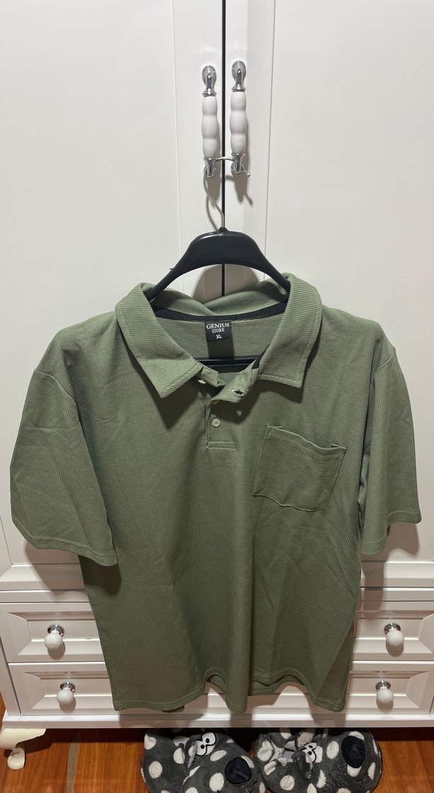 Erkek keten kumaştan yapılmış, kısa kollu, yakalı ve bol kesim haki polo tişört. Günlük kullanım için rahat ve şık bir tercih.