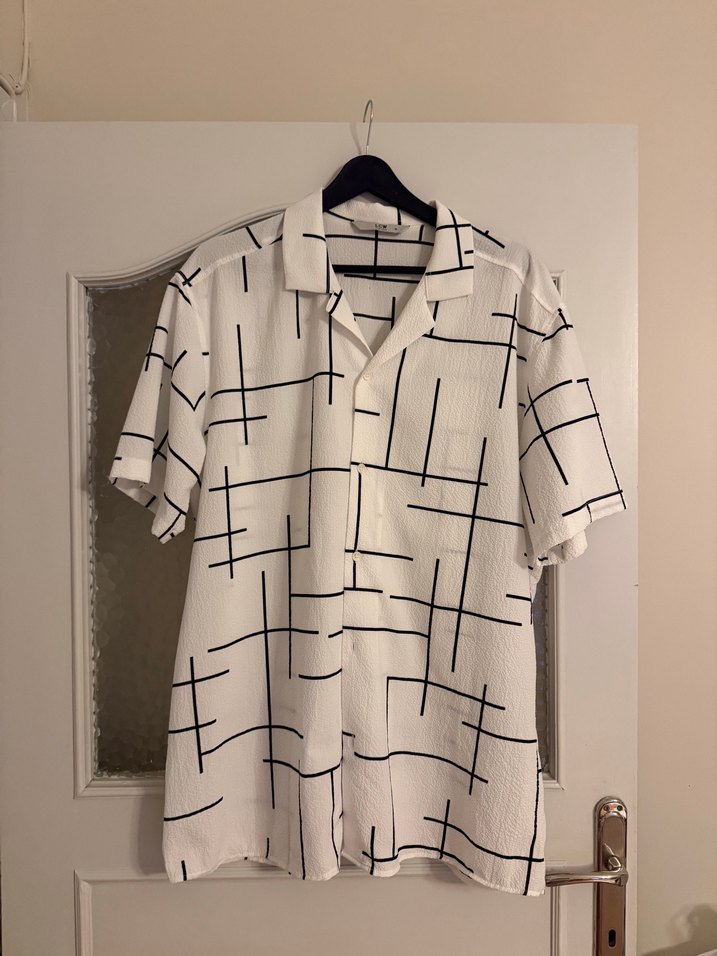 Erkekler için keten, kısa kollu, düğmeli ve yakalı gömlek. Baskılı deseni ve bol kesimiyle günlük rahat kullanım için uygundur.
