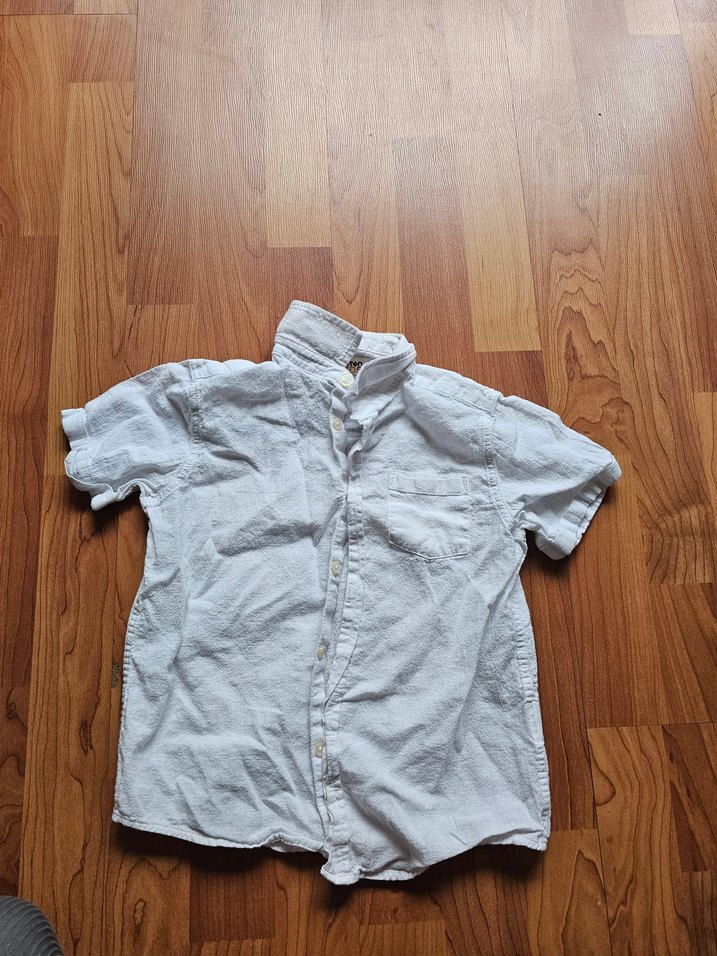 Erkek çocuklar için keten kumaştan üretilmiş, düğmeli ve kısa kollu, bol kesim gri renkli gömlek. Sokak stiline uygun sade tasarım. koton marka 5 6 yaş sorunsuz