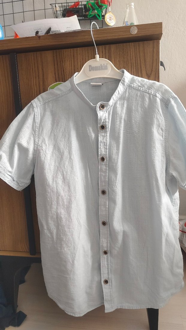 Erkek çocuklar için keten kumaştan, düğmeli, kısa kollu ve yakalı, bol kesim buz mavi gömlek. Sokak modasına uygun sade tasarım.