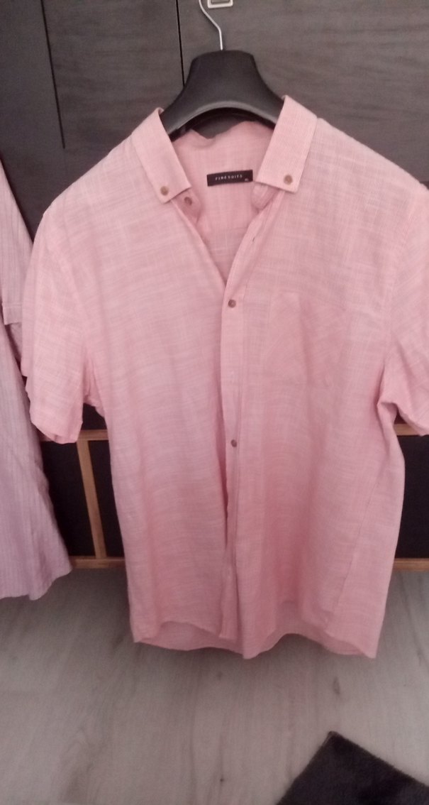 Erkekler için keten kumaştan, kısa kollu ve yakalı, düğmeli, rahat kesim pembe gömlek. Günlük sokak stiline uygun.