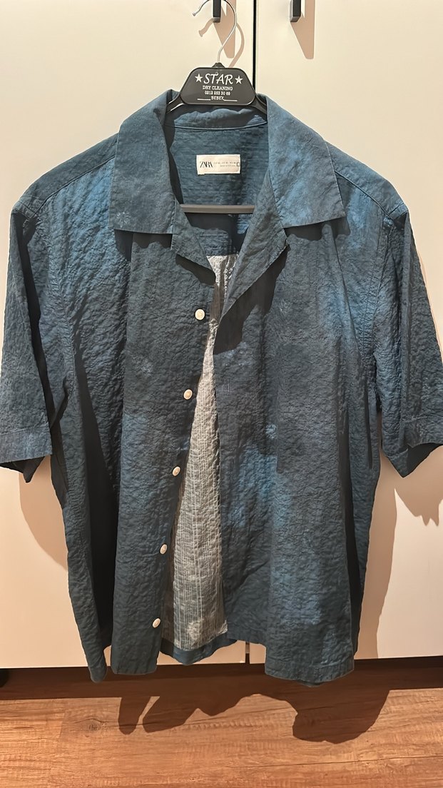 Erkekler için keten, kısa kollu, düğmeli, yakalı ve bağlama desenli mavi gömlek. Rahat kesimiyle günlük sokak stiline uygun.