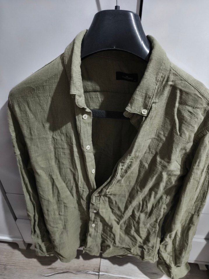 Erkekler için keten kumaştan yapılmış, bol kesim ve uzun kollu khaki gömlek. Düğmeli ve yakalı tasarımıyla günlük kullanıma uygun rahat bir sokak stili sunar.