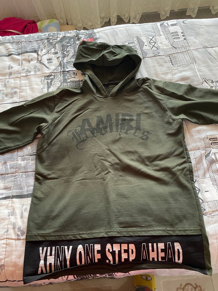 Erkekler için bol kesim, kapüşonlu ve uzun kollu khaki sweatshirt. Yumuşak keten kumaştan, baskılı desenli ve alt kısmında siyah panelde büyük harfli yazılar var.