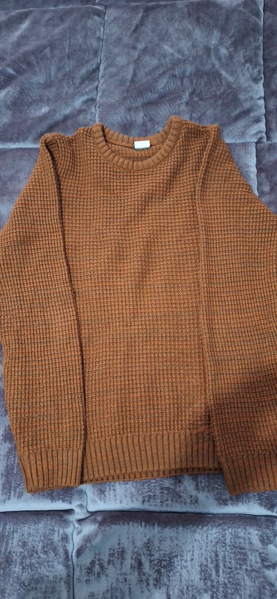 erkek kiremit rengi örgü kazak, yuvarlak yaka ve uzun kolludur. Gevşek kesimi ve normal boyuyla rahat sokak stili için uygundur. Günlük kullanıma ideal, sıcak ve konforlu bir seçimdir.
