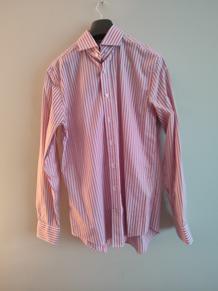 Düğmeli ön kısmı ve yakalı uzun kollu erkek gömleği, normal midi boy ve regular kesimdedir. Pastel kırmızı çizgili deseniyle ofis için uygun, trend sokak stili sunar.