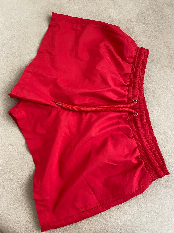 Parlak kırmızı, kısa kesim ve vücuda oturan erkek şortu, dış mekan ve athleisure kullanıma uygundur. Deniz şortu