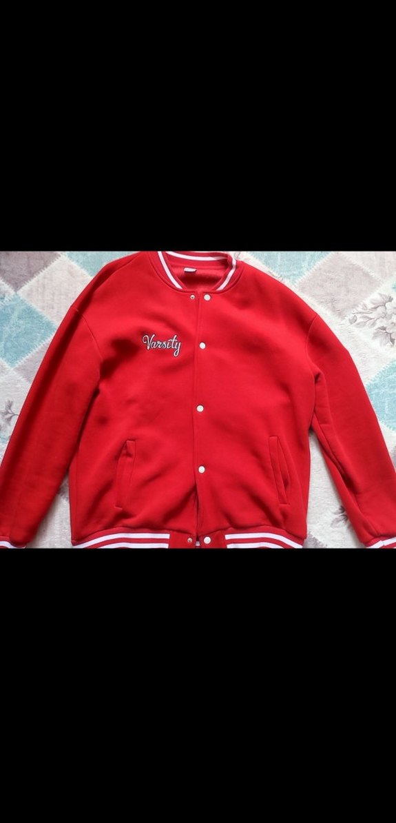 Erkek için kırmızı, düğmeli, bol kesim, bisiklet yaka, renkli baskılı, yumuşak ve sıcak kumaştan yapılmış street wear ceket. 'Varsity' yazısı bulunur. Herhangi defosu yok sıfır üründür etiketsizdir.