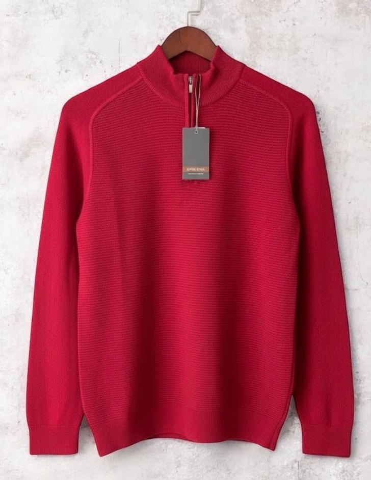 Erkekler için yüksek yakalı, fermuarlı ve uzun kollu yarım balıkçı kazak. Rahat kesim ve yumuşak, sıcak kumaştan, canlı kırmızı renkte, dış mekan kullanımı için uygundur.