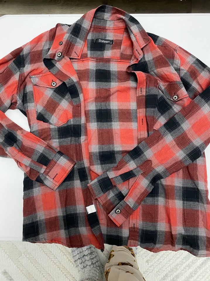 Erkek için kırmızı ve gri kareli, uzun kollu, düğmeli ve notched lapel yakalı bol kesim gömlek. Günlük rahat kullanıma uygun tekstil kumaş.