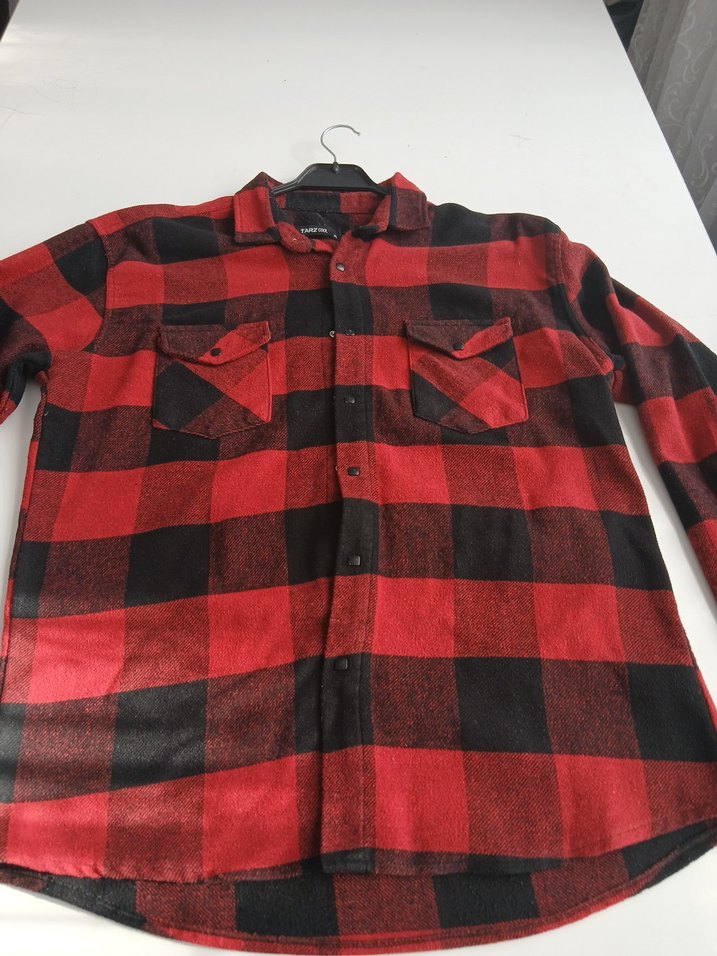 erkekler için düğmeli, uzun kollu, yumuşak ve sıcak kumaştan yapılmış kırmızı-siyah kareli gömlek. Rahat kesimi ve yakasıyla sokak stili için uygun.