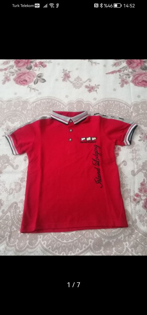Erkekler için kırmızı renkli, düğmeli polo yaka kısa kollu tişört. Renkli baskılı detaylara sahip, yumuşak ve sıcak kumaştan üretilmiştir.