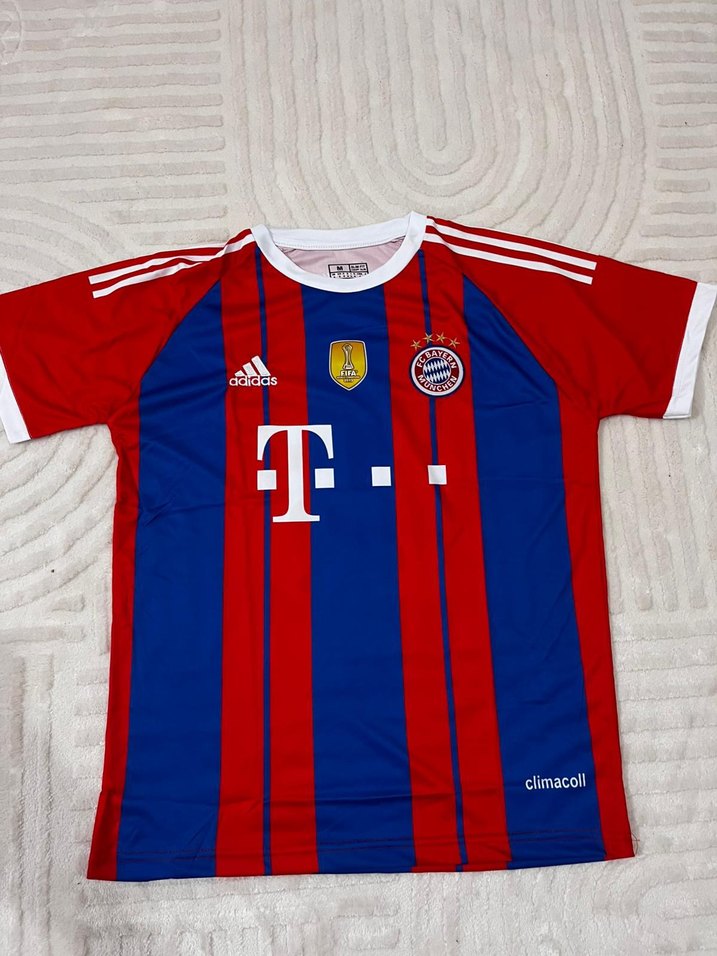 Erkekler için kırmızı ve mavi baskılı, kısa kollu, bisiklet yaka, sentetik kumaştan spor forması. Düğme detaylı ve streetwear tarzında, sportif kullanıma uygun. ⚽