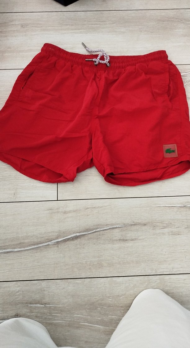 Erkekler için kırmızı, düğmeli, bol kesim mini yüzme şortu. Plaj ve günlük spor tarzına uygun, sade ve renkli bir model.