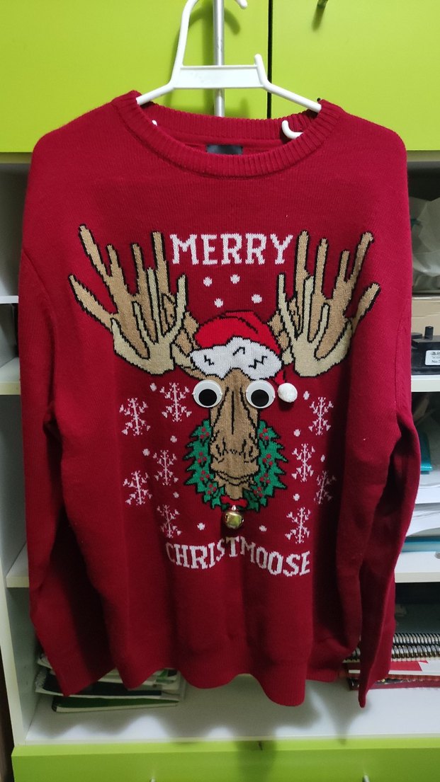 Kırmızı örgü yün kazak, uzun kollu ve yuvarlak yakalıdır. Renkli desenli, rahat kesim ve parti için uygun, neşeli geyik figürü bulunur. M beden ama L de giyebilir. teklif verebilirsiniz