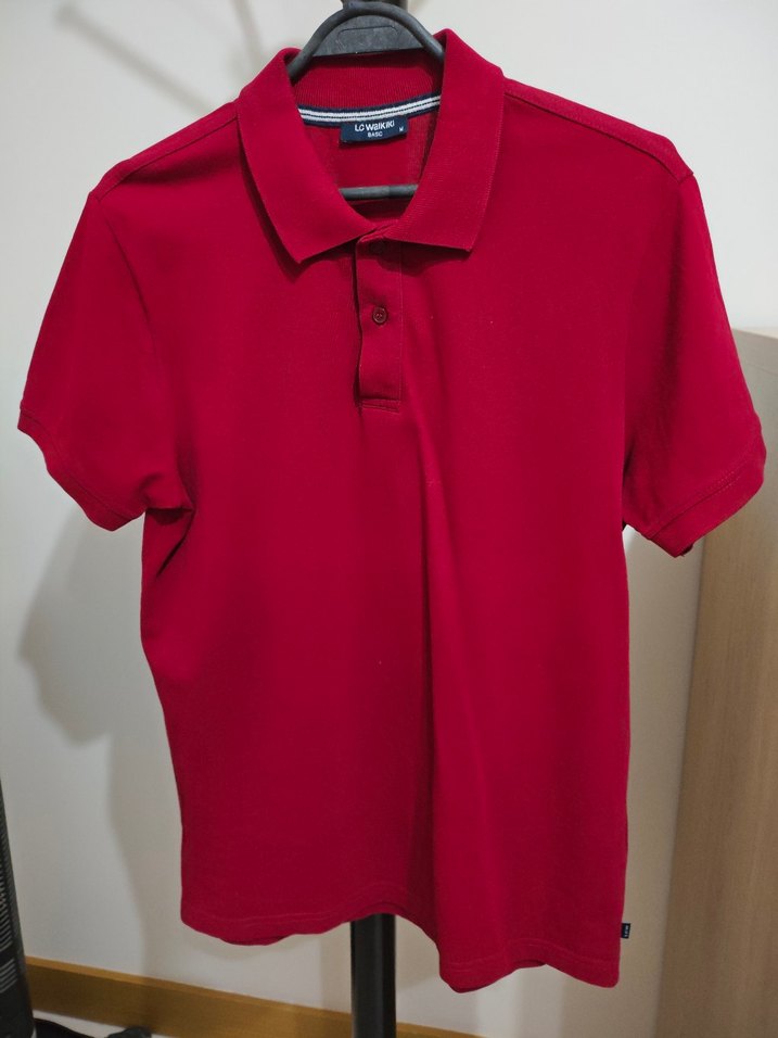 Kırmızı renkli, kısa kollu ve yakalı erkek polo tişört. Normal boyda, vücuda oturan kesimi ve yumuşak sentetik kumaşıyla günlük rahat stil için uygundur.