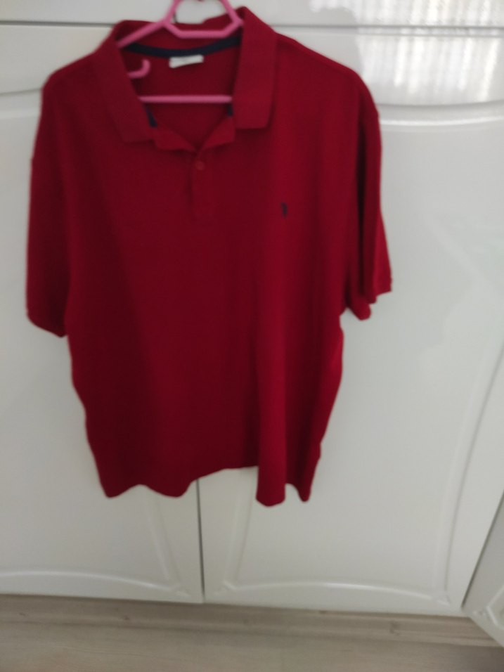 Erkek kırmızı polo yaka tişört, kısa kollu ve bol kesimdir. Pürüzsüz sentetik kumaştan yapılmıştır ve günlük rahat kullanıma uygundur.