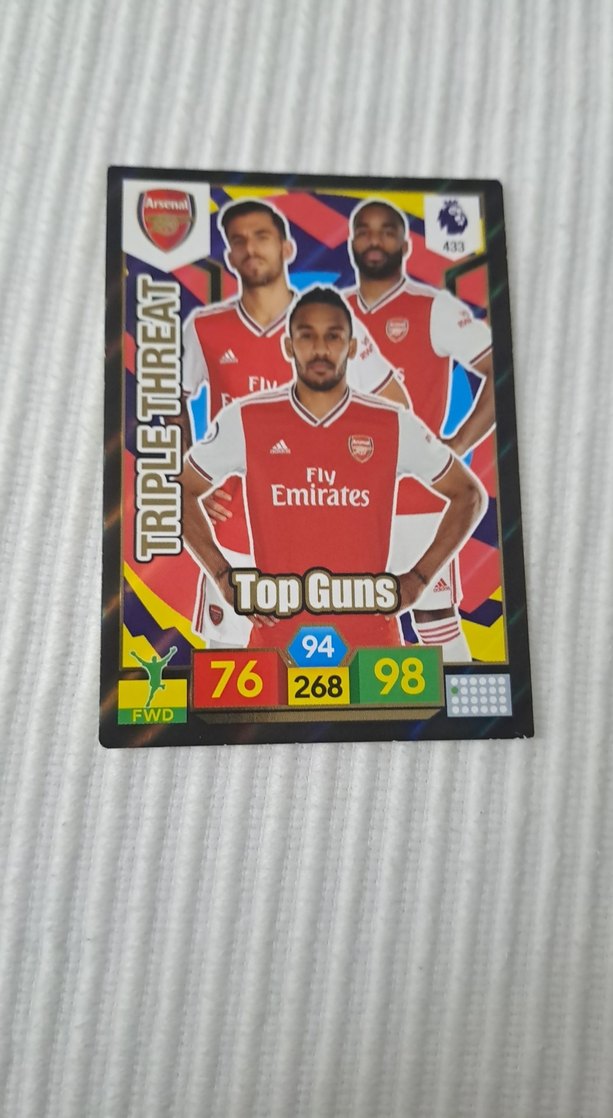 Erkekler için kırmızı Arsenal formalı, 'Top Guns' etiketli, cesur ve koyu pop kültür tarzında rozet. ⚽