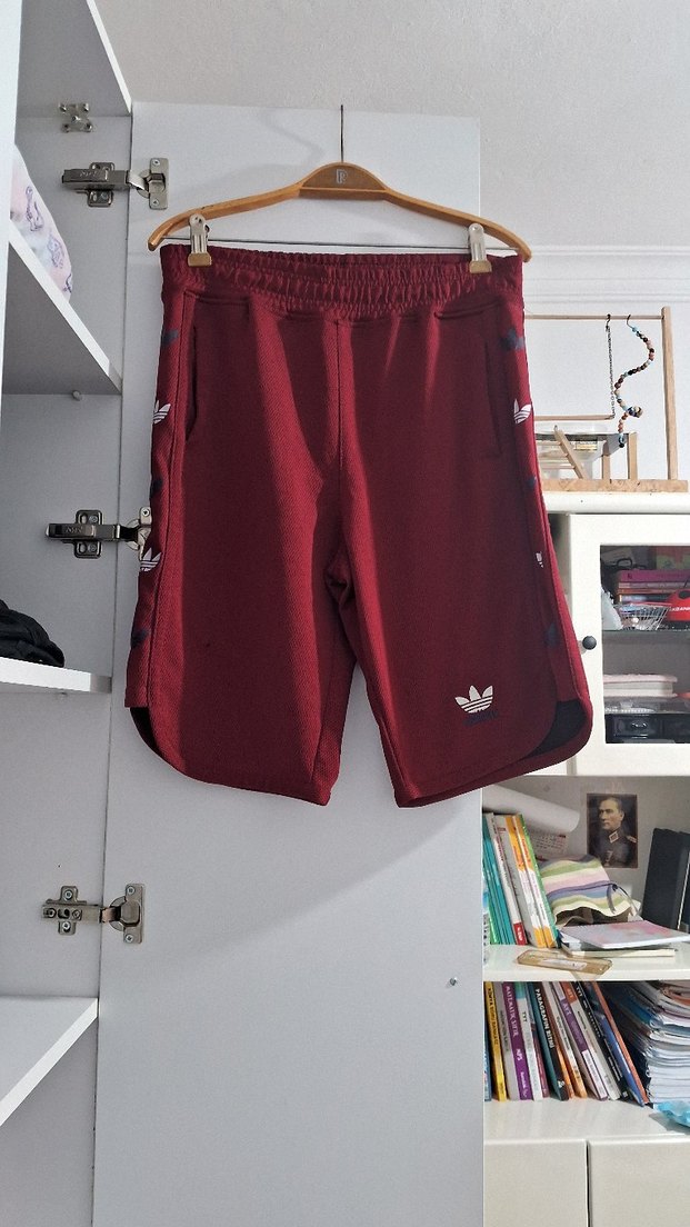 Erkekler için rahat kesim ve kısa boyda, yumuşak ve sıcak kumaştan yapılmış koyu kırmızı şort. Düğmeli detaylar ve spor tarzıyla günlük kullanıma uygun.