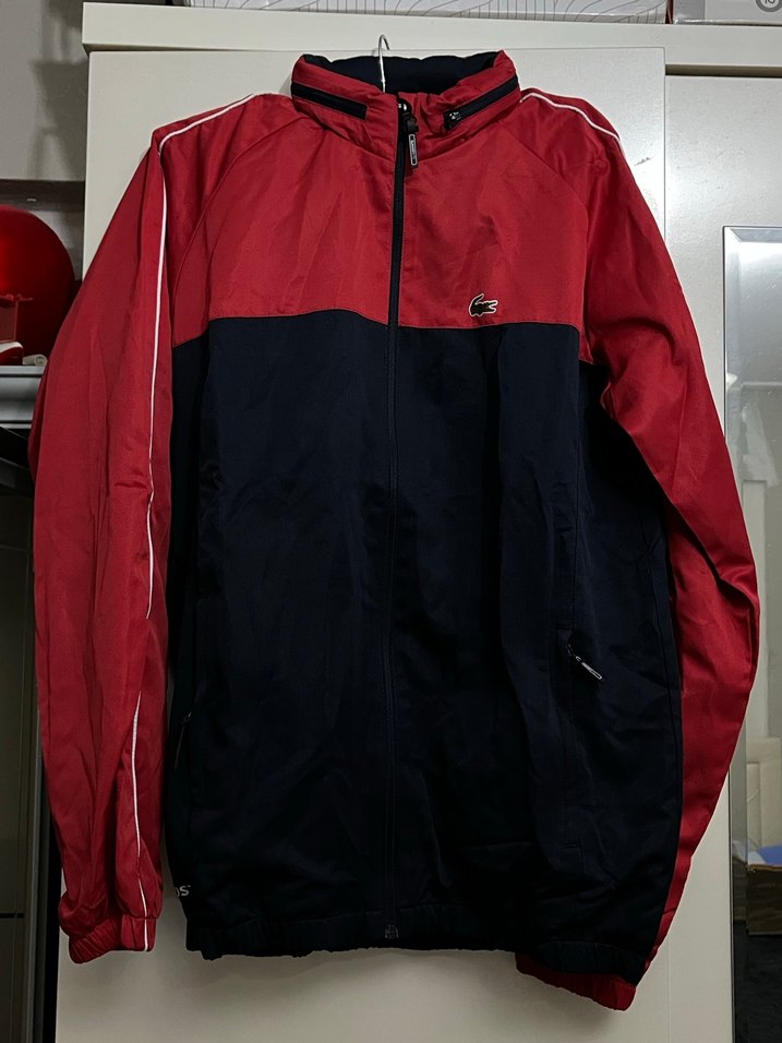 Erkekler için yüksek yakalı, uzun kollu, fermuarlı spor mont. Gizli şapkalı polyester kırmızı ve siyah renklerde.