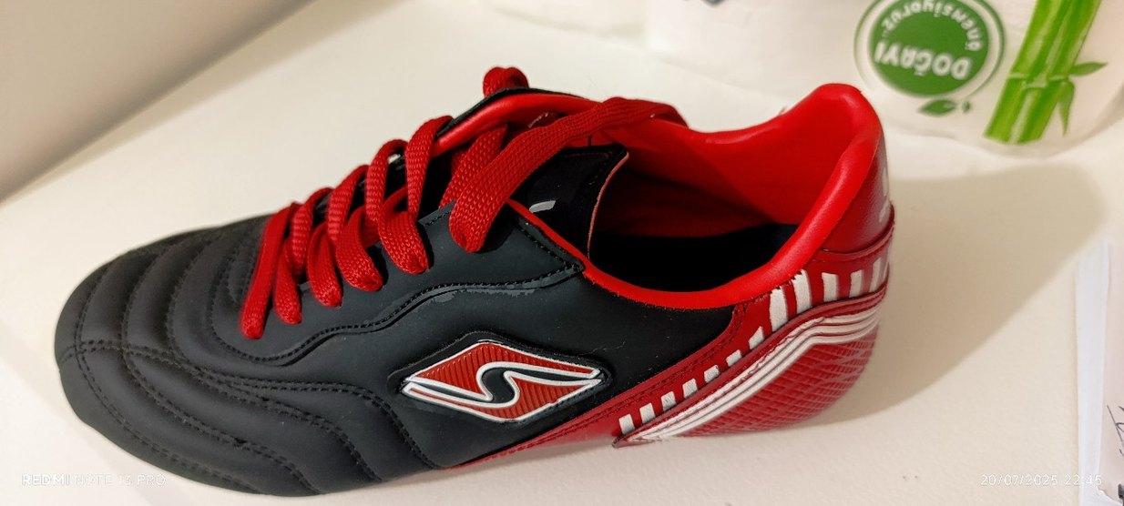 Kırmızı renkli, velcro ve bağcıklı, kauçuk malzemeden yapılmış erkek futbol ayakkabısı. Spor ve sokak stiline uygun, trend renkli tasarım. ⚽