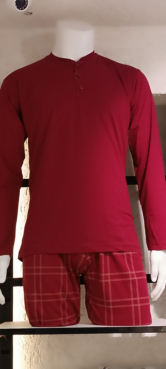 Erkekler için kırmızı, uzun kollu, bisiklet yaka ve sade üst ile kareli midi boy pantolonlu, şık ve rahat pijama takımı.