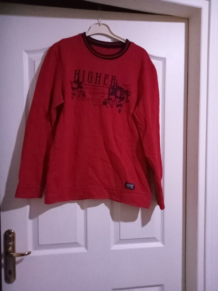 Erkek için uzun kollu, yuvarlak yaka ve bol kesim kırmızı sweatshirt. Önünde "HIGHER" baskılı, rahat ve sıcak kumaştan üretilmiştir. s bedendir