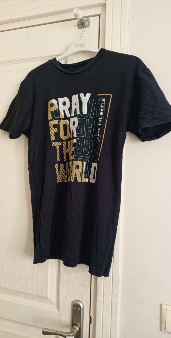 Erkekler için bol kesim, kısa kollu, yuvarlak yaka tişört. Üzerinde koyu altın ve beyaz renklerde "PRAY FOR THE WORLD" baskısı bulunur. ✨