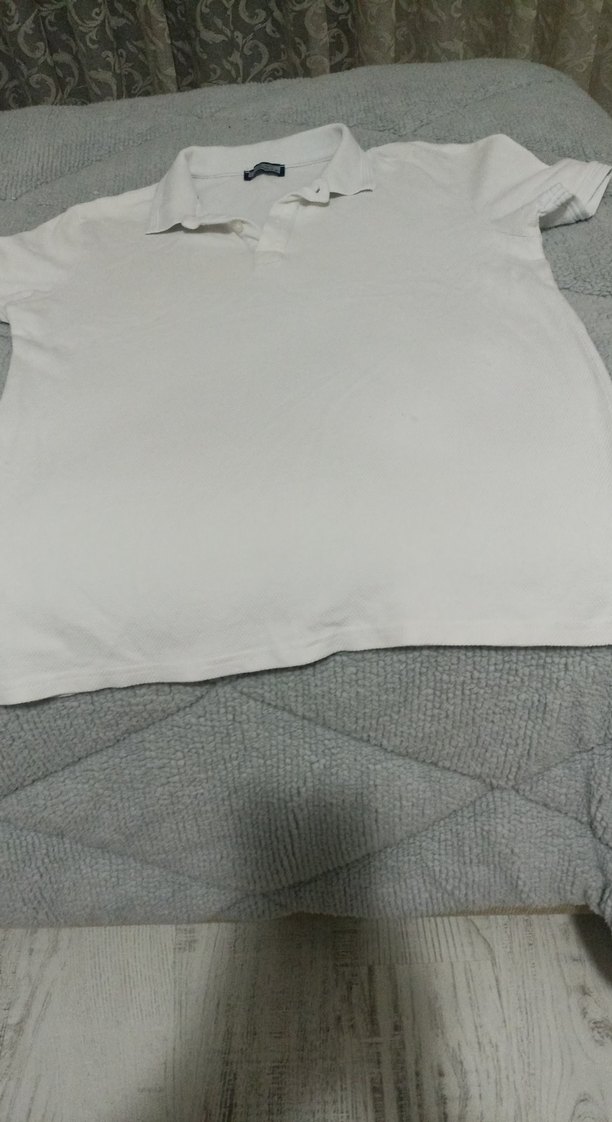 Beyaz renkli, keten kumaştan erkek polo tişört. Kısa kollu, çok minik bı defosu var fotoda çektim almak istdgnzde detaylı atarim