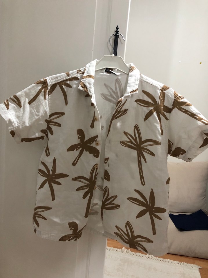 Erkek çocuklar için kısa kollu, bol kesim keten gömlek. Beyaz zemin üzerine kahverengi palmiye desenleriyle trend sokak stili için uygundur.