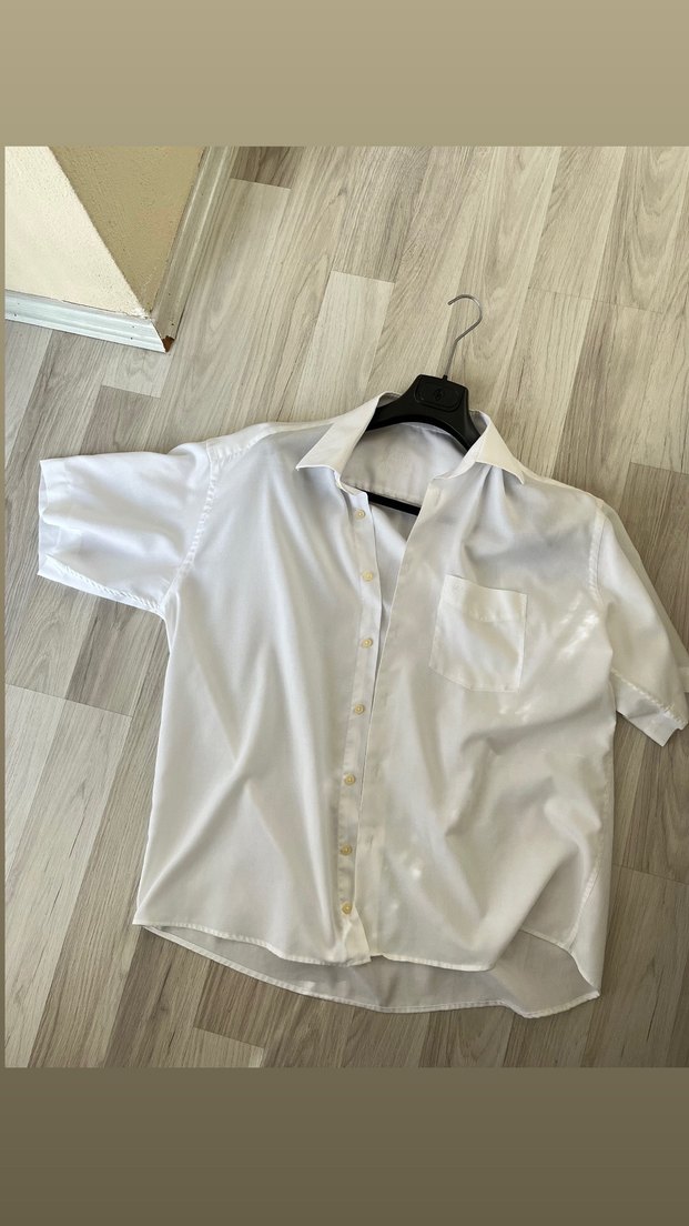 Beyaz, keten kumaştan, kısa kollu, düğmeli ve yakalı gömlek. Gevşek kesimi ve parlak dokusuyla gündelik sokak stiline uygundur.