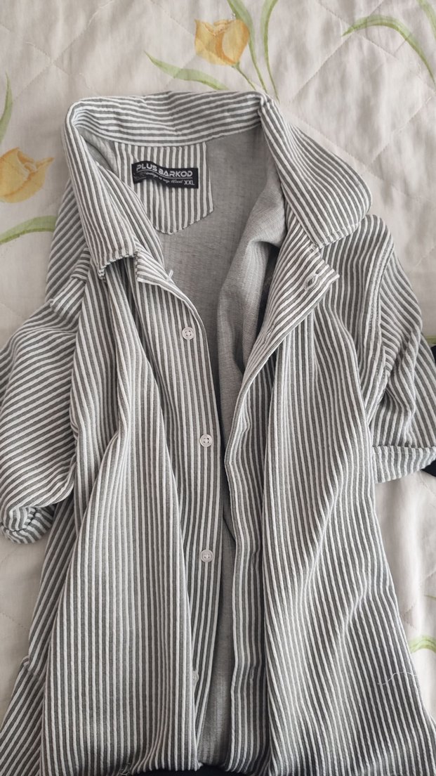 Gri keten kumaştan, kısa kollu, düğmeli ve yakalı kadın gömleği. Normal uzunlukta, rahat kesim ve midi boyda, günlük sokak stiline uygun. XLL beden ama xs olarak yaptırdım yaptırdıktan sonra Bi kaç kez giyildi