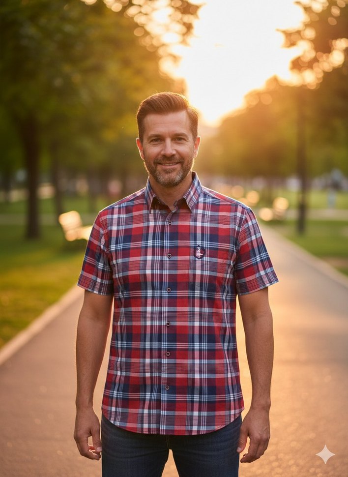Erkekler için kısa kollu, yakalı ve düğmeli gömlek. Rahat kesimli, bej ve açık tonlarda kareli desenli, pamuklu kumaştan. Açık hava için uygun.