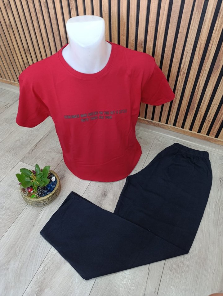 Erkek pijama takımı, kırmızı kısa kollu ve baskılı üst ile siyah bol kesim pantolondan oluşur. Spor ve rahat stil sunar. Bedenleri M✔️L✔️XL✔️XXL