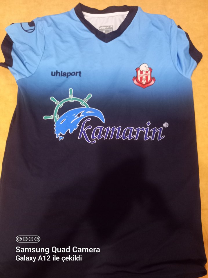 Fitted kesim, kısa kollu, koyu mavi baskılı erkek forma. Plastik malzemeden, bisiklet yaka ve kısa boy. Spor ve sokak stiline uygun.