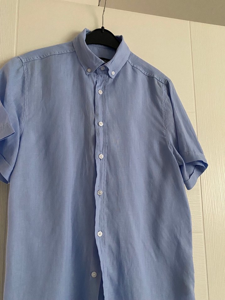 Erkek kısa kollu, yakalı ve düğmeli ön kısmı olan keten gömlek. Yumuşak keten kumaştan, normal boy ve regular fit, günlük sokak stili için uygun.