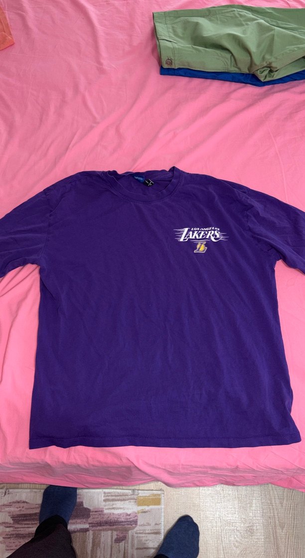 Pastel mor renkli,M BEDEN, kısa kollu, Geniş kalıplı, LAKERS baskılı tişört