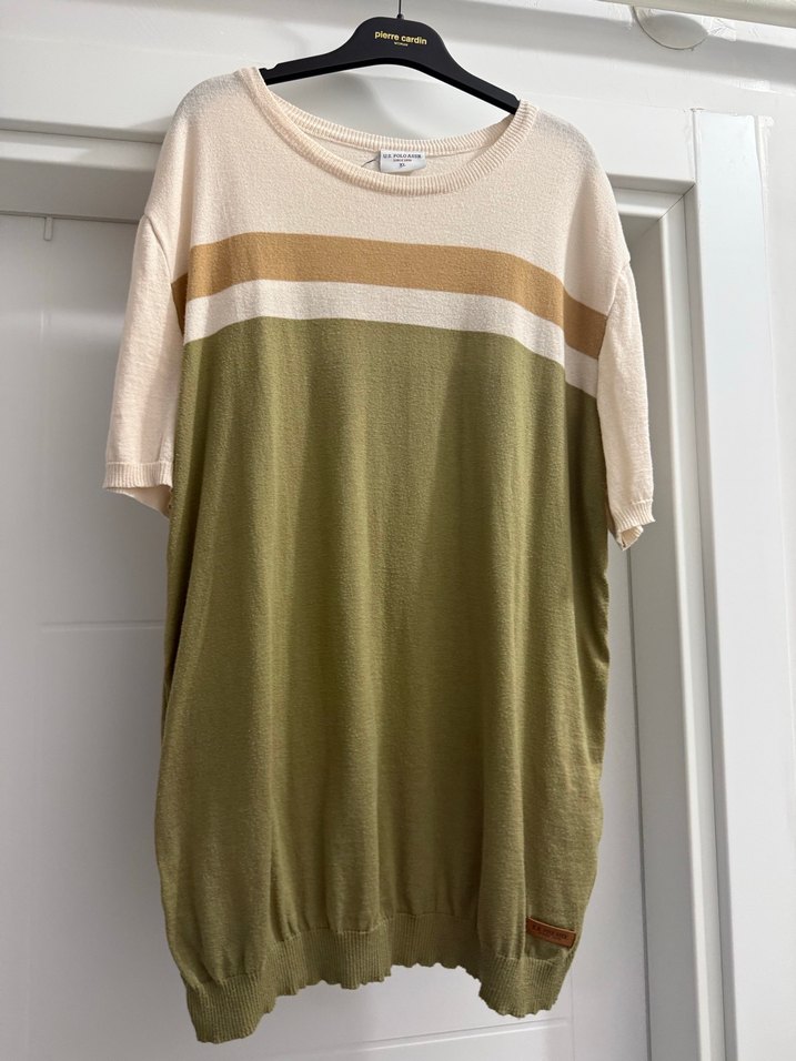 Erkekler için kısa kollu, yuvarlak yaka ve örme dokulu tişört. Açık haki renkte, bej ve kahverengi yatay çizgilerle, rahat pamuk kumaştan üretilmiştir. Günlük sokak stili için uygundur.