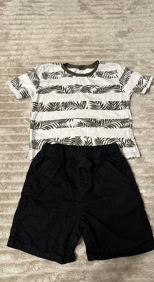 Yumuşak pamuklu kumaştan yapılmış, kısa kollu, bisiklet yaka yaprak desenli tişört ve koyu renk şorttan oluşan erkek sokak stili takımı.