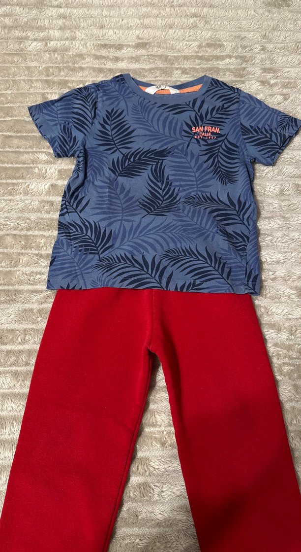 erkek için kısa kollu, yaprak desenli, yuvarlak yakalı üst ve canlı kırmızı, yumuşak ve sıcak kumaştan pantolon takımı.