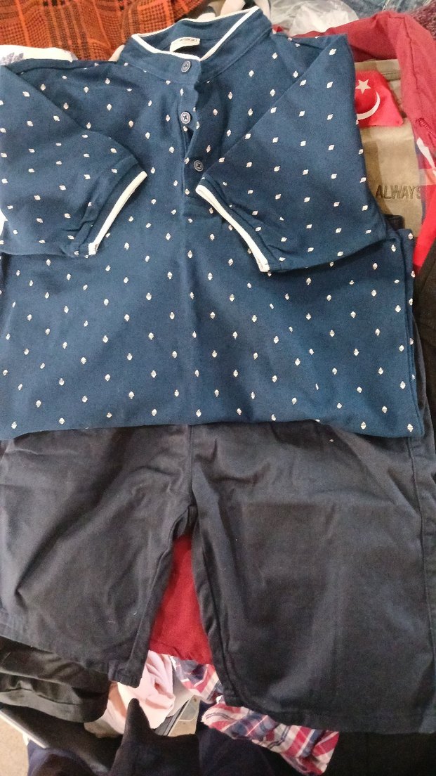 Erkek sort tişört takımı, kısa kesim, düğmeli ve yakalı üst ile koyu mavi şortlardan oluşur. Kısa kollu üst, sade desene ve rahat sokak stiline sahiptir.