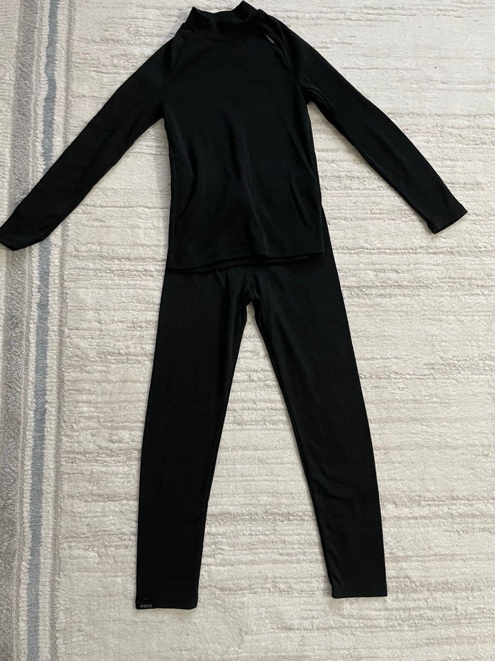 Erkek çocuğu siyah yüksek yaka ve uzun kollu içlik alt üst takımı taytı ile birlikte, yumuşak ve sıcak kumaştan, vücuda oturan ve normal boyda.