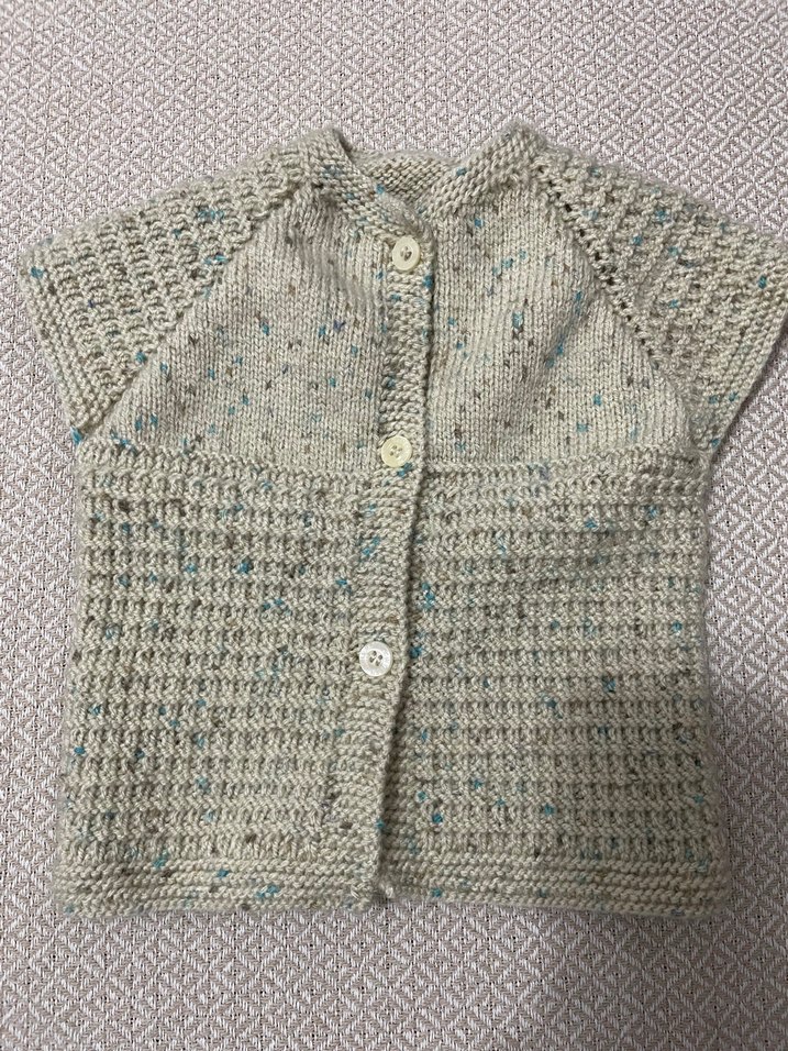 Kız erkek bebek için kolsuz, açık kahve örgü kumaştan yapılmış bol kesim hırka. Düğmeli ve desensiz sade tasarıma sahiptir. 0-1 yaş arasıdır.