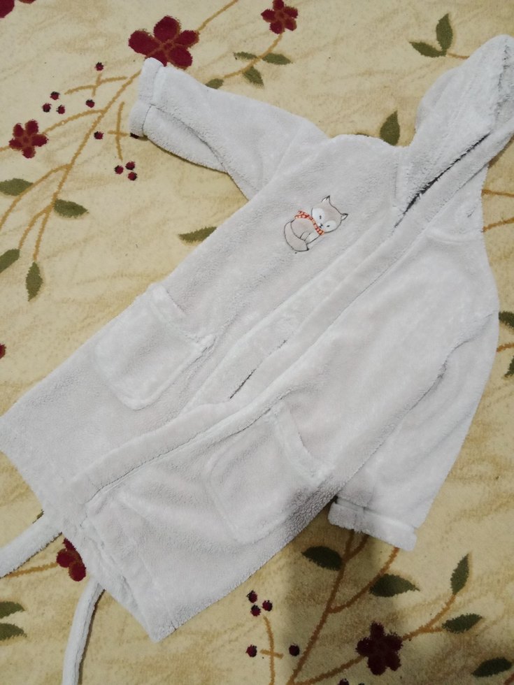 Yumuşak ve sıcak kumaştan gri çocuk bornozu, nakışlı kedi deseni ve kapüşon içerir. 3 4 5 yaş
