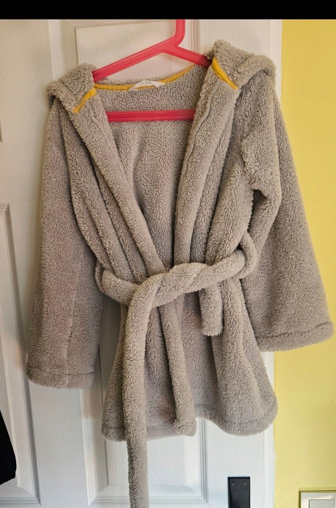 cocuklar için gri renkte, kapüşonlu ve belden bağlı, yumuşak dokulu, desensiz sabahlik. 6-7 yas penti