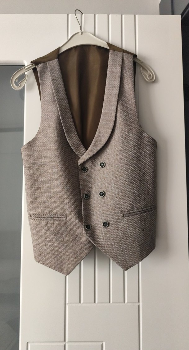 Erkekler için keten kumaştan yapılmış, bej renkli, düğmeli klasik yelek. Klasik kesim, çıtçıt yakalı ve kolsuz tasarıma sahiptir, günlük kullanıma uygundur.