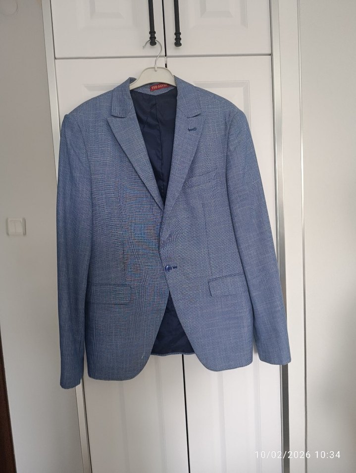 Erkekler için klasik kesim, düğmeli mavi ceket. Notch yaka ve uzun kolludur, ofis ve günlük kullanıma uygundur.