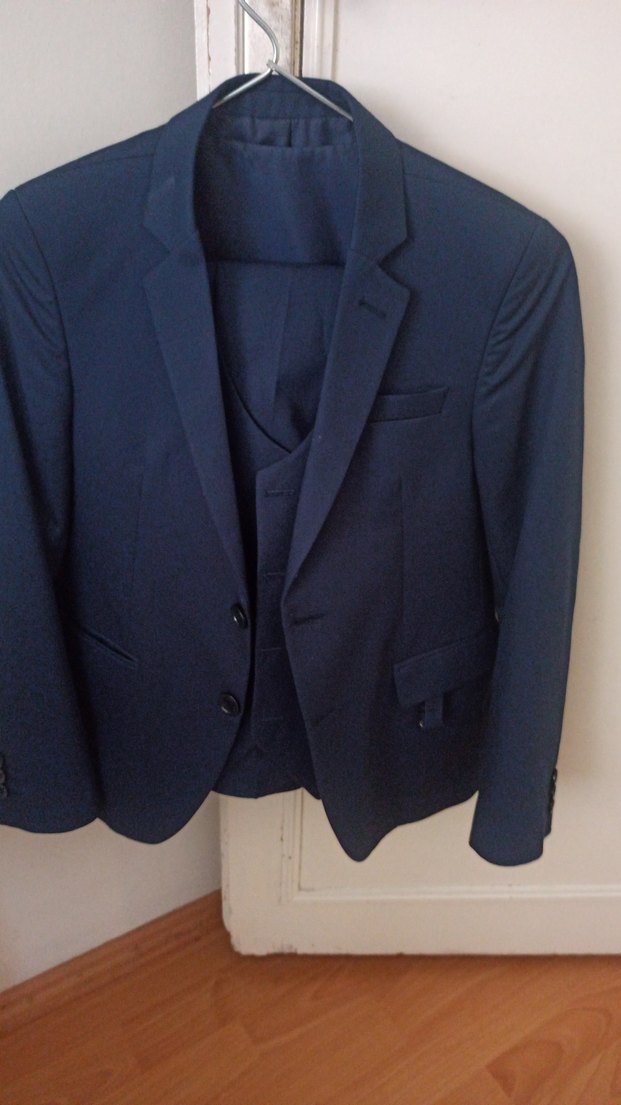 Erkekler için lacivert takım elbise, çıtmalı yakalı, uzun kollu ve normal kesimlidir. Ofis ortamına uygun, düğmeli ve desensiz klasik tarzda. ️