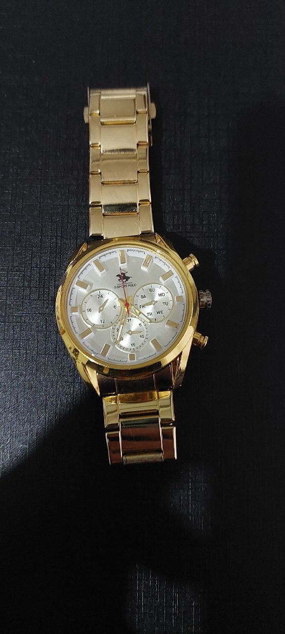 Parlak altın renkli metal çoklu alt kadranlara sahip yuvarlak kadran ile klasik ve modern tarzı birleştiren erkek saati. ⌚