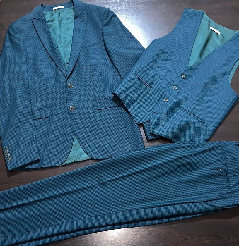 Erkek Takım Elbise. 48 beden. Temiz. Yelek Ceket ve Pantolon. Takımın yanında beyaz gömlek hediye ediyorum.
